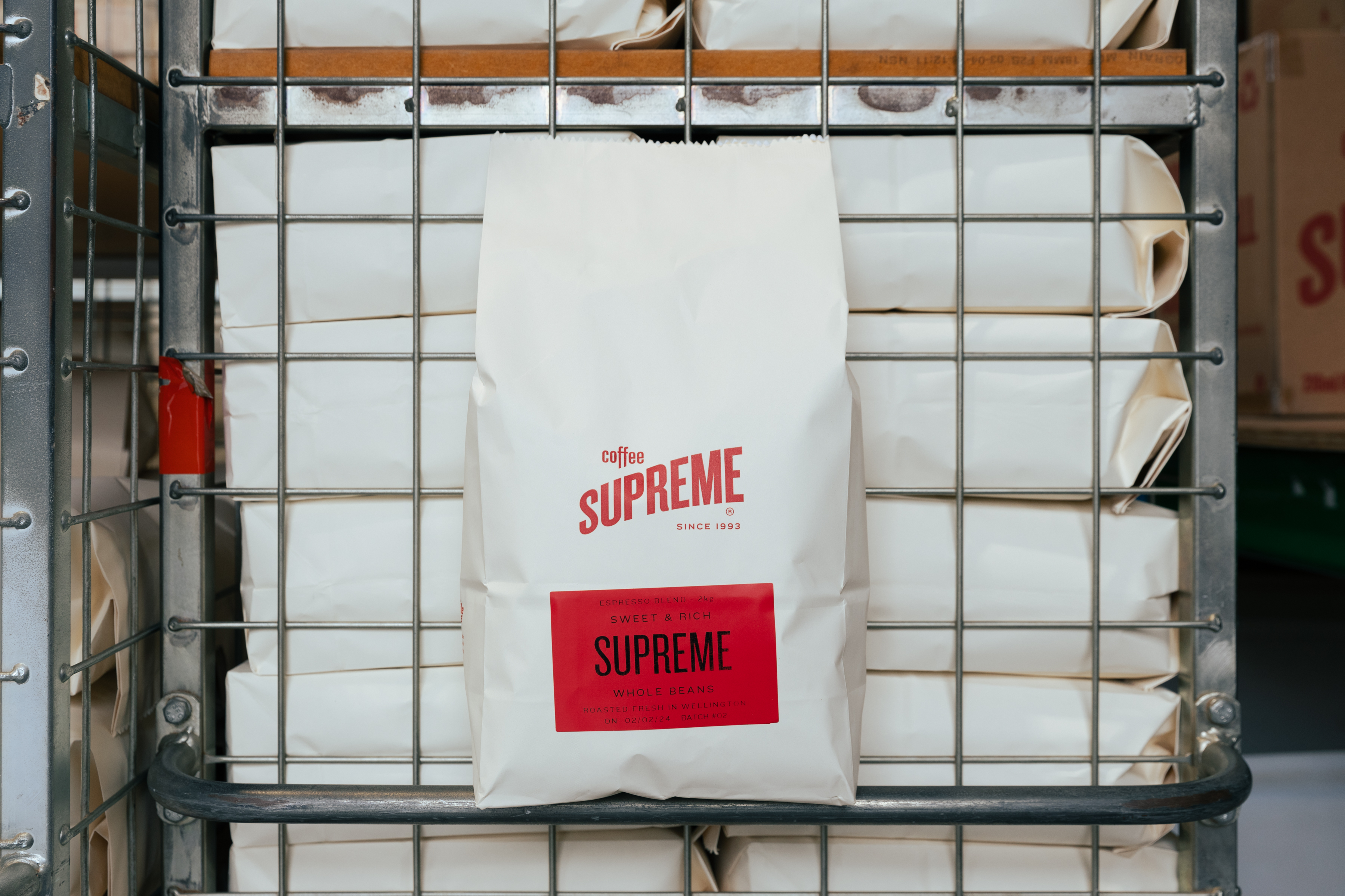 Once you've opened your fresh bag of Supreme, we encourage you to transfer it to an airtight container — just like you'd do with a packet of Tim Tams. A Coffee Supreme Tin, jar or Tupperware container will do the trick too. If you haven't got any of the above handy, our trusty Penco Clip over the top of the bag will also do a solid job. Just make sure you store your coffee in a cool, dry place.