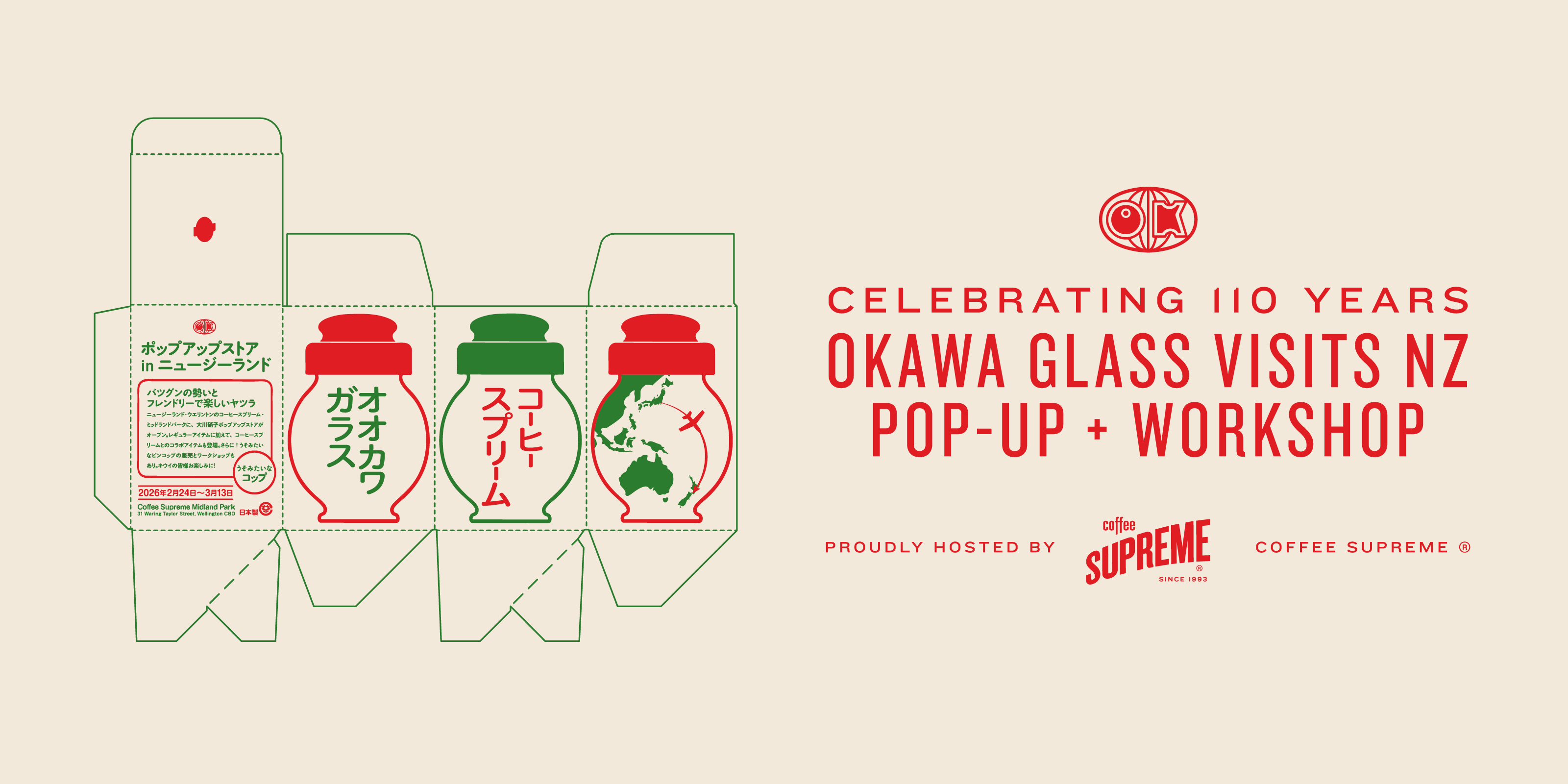 Founded in Tokyo in 1916, Okawa Glass has been producing beautifully considered glassware for over a century. To mark 110 years, Okawa Glass are coming to Wellington with a special pop-up and workshop series at Midland Park, alongside the release of the Coffee Supreme x Okawa Glass BINKOP glass and server.