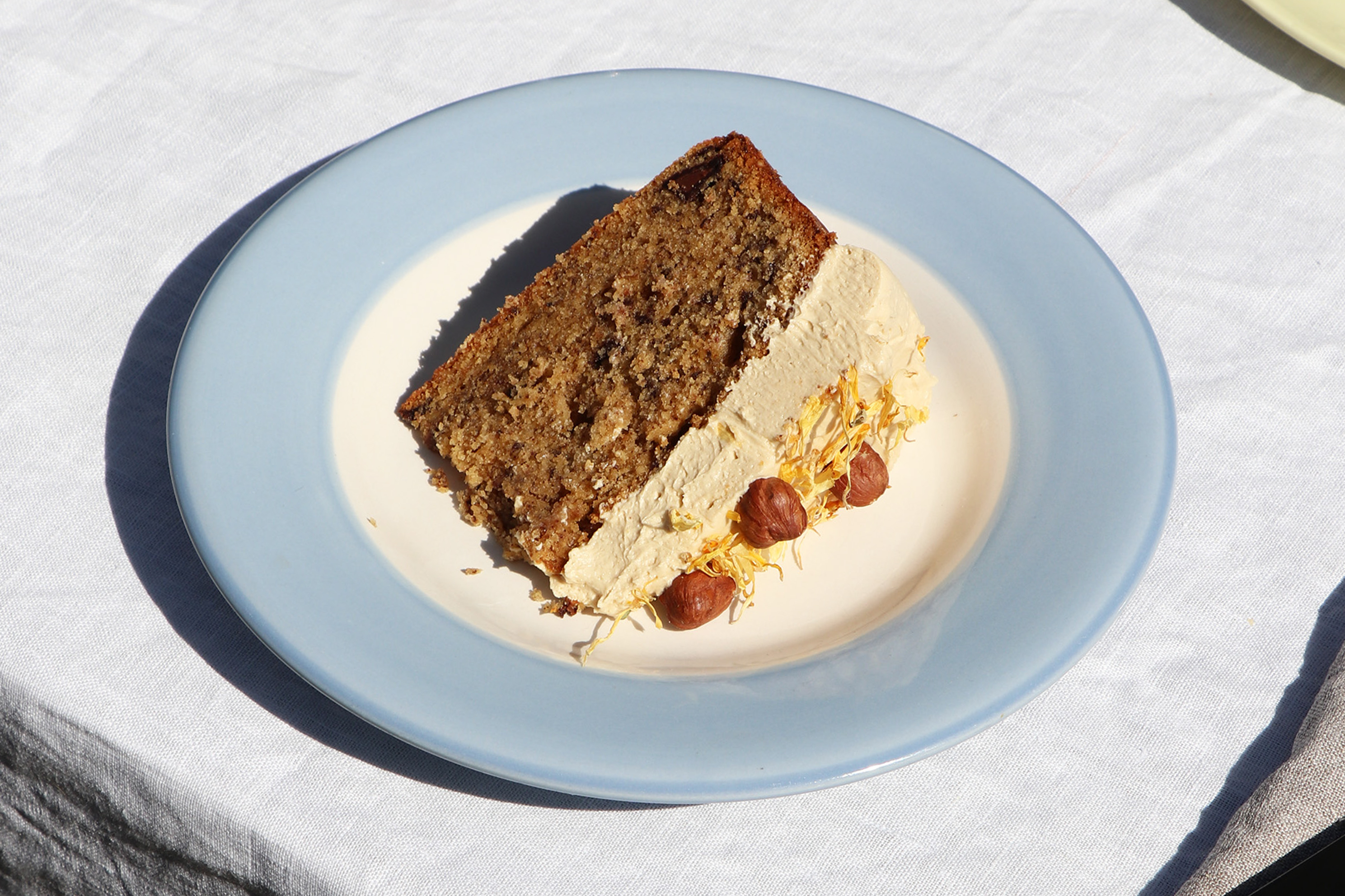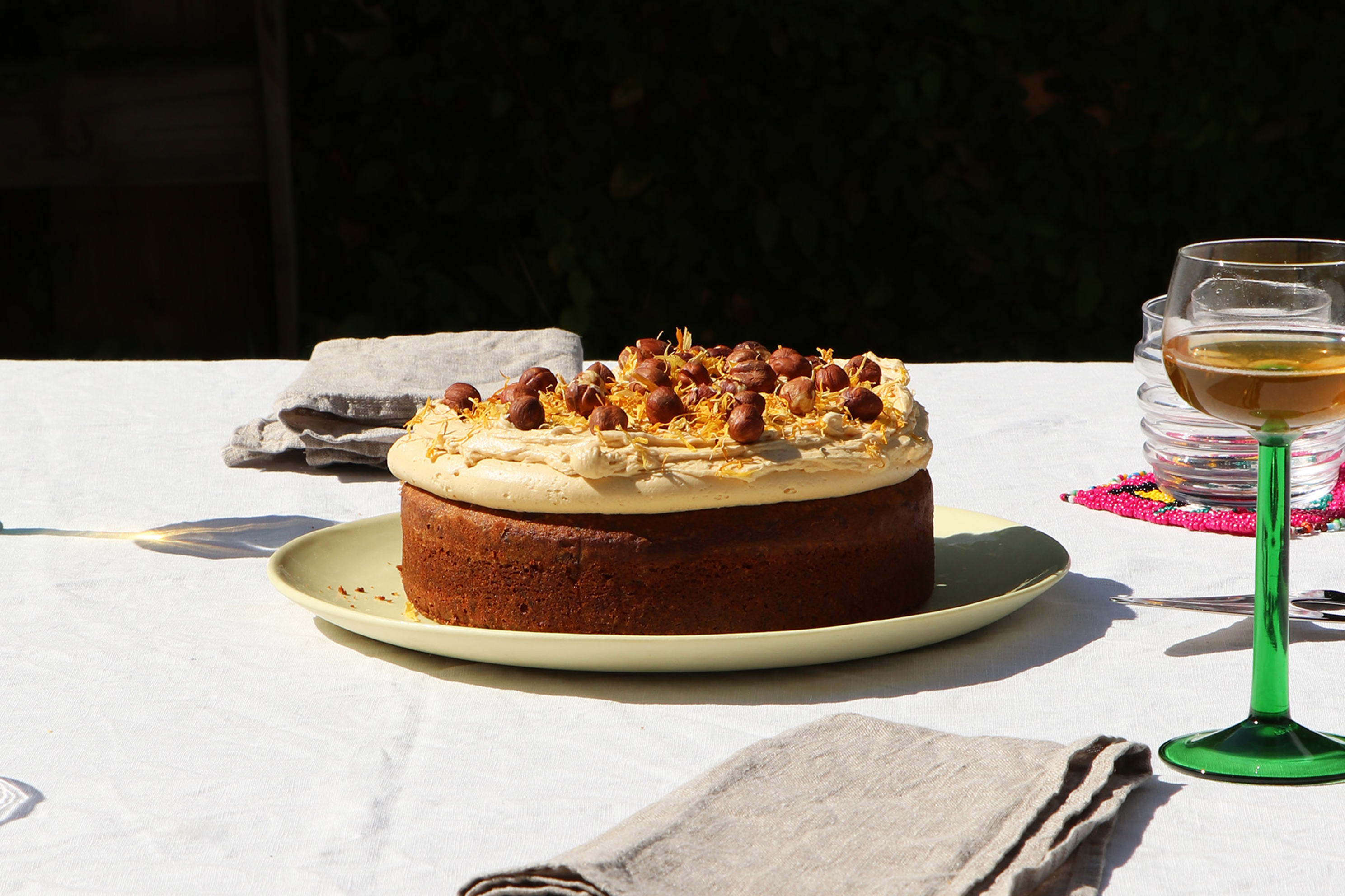 Spread your coffee buttercream all over the top of your cake and decorate however you like, some extra roasted hazelnuts, whole or chopped, scattered over the top is a delicious addition.