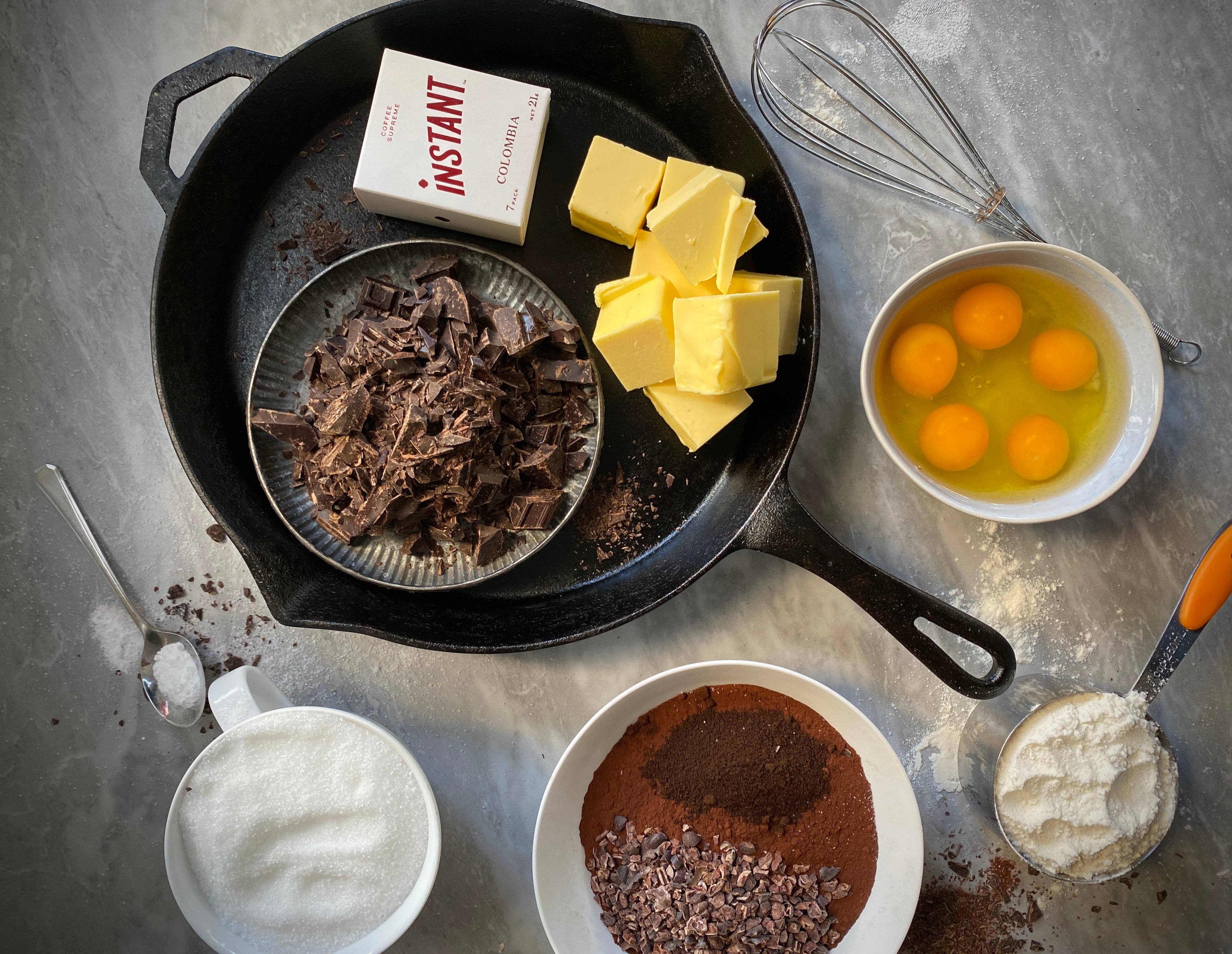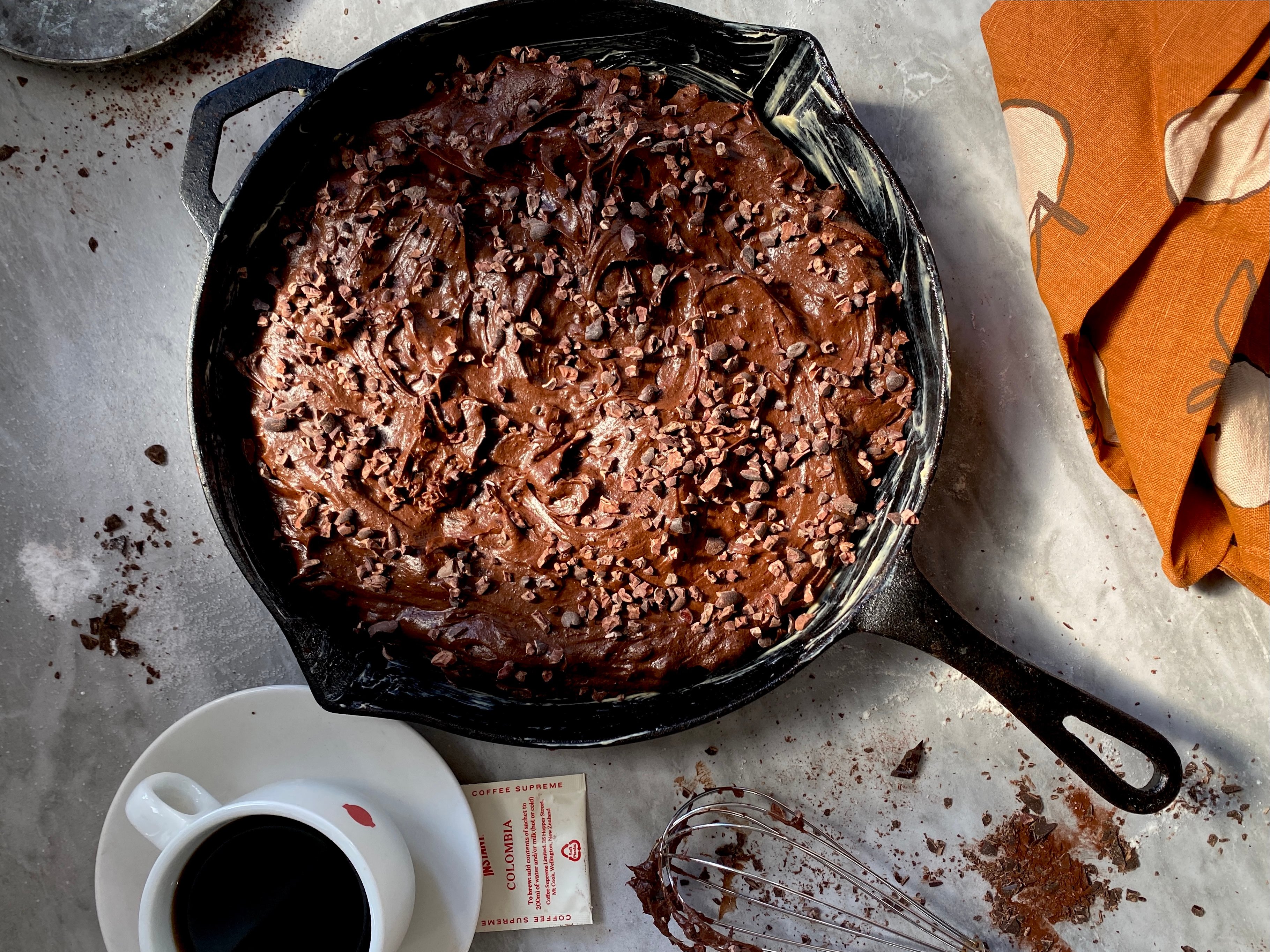 3. And now the brownie! Preheat oven to 160°C and lightly grease your Ironclad cast iron pan with butter. Pour melted butter over cocoa in a stand mixer and beat to combine. Add sugar and vanilla and beat again. Add eggs, one at a time then beat on high speed for about 5 minutes. Sift in flour, espresso powder, instant coffee powder, salt and baking powder. Add chopped chocolate and mix until completely incorporated. Pour mix into pan, smooth the top and sprinkle with cacao nibs. Bake for 30 minutes.