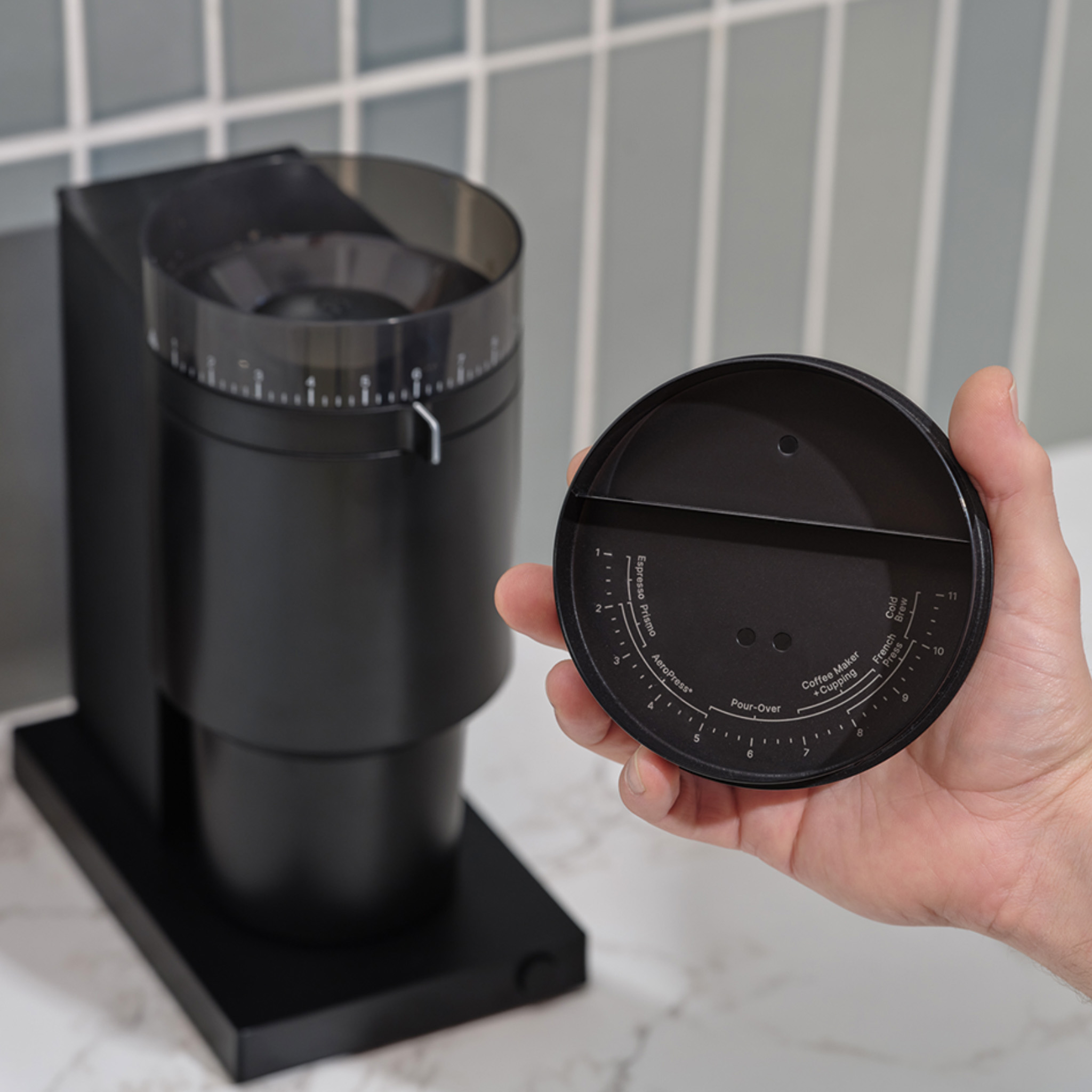 Opus includes a volumetric dosing lid to measure beans, a spouted catch for mess-free transitions, anti-static technology to minimize retention, and a grind guide so you’re never lost.